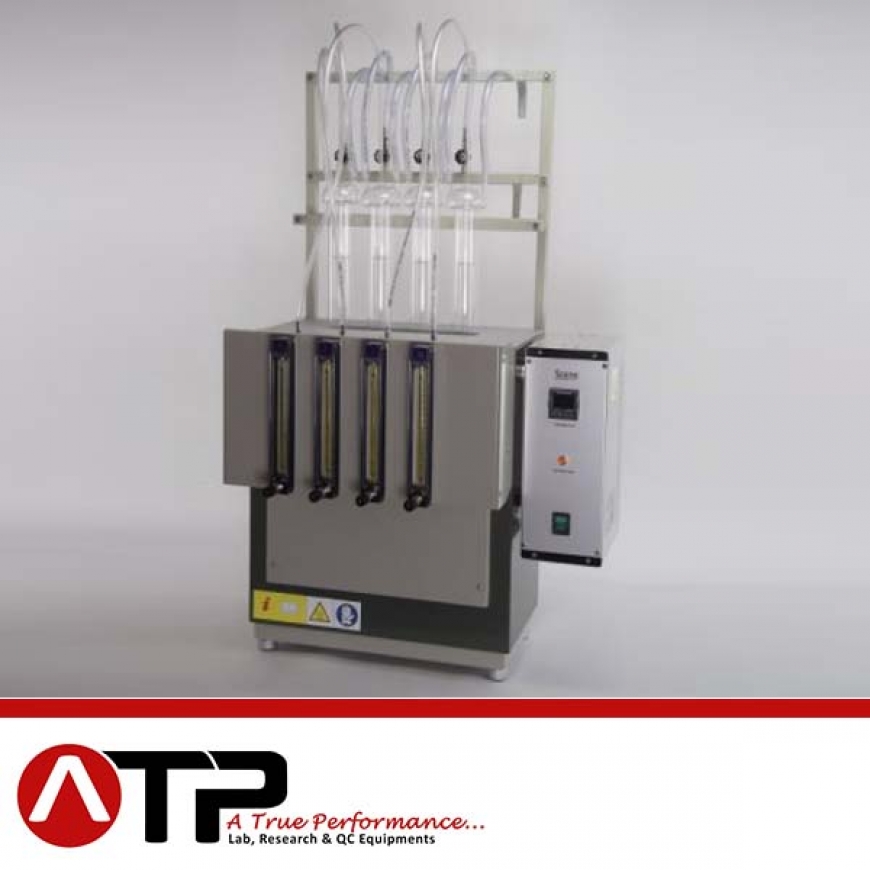 The apparatus consists of a benchtop steel case containing an aluminium thermostatic block with the holes for the introduction of the oxidation cells, a support for the flowmeters and a water dispenser for the condensers refrigeration.